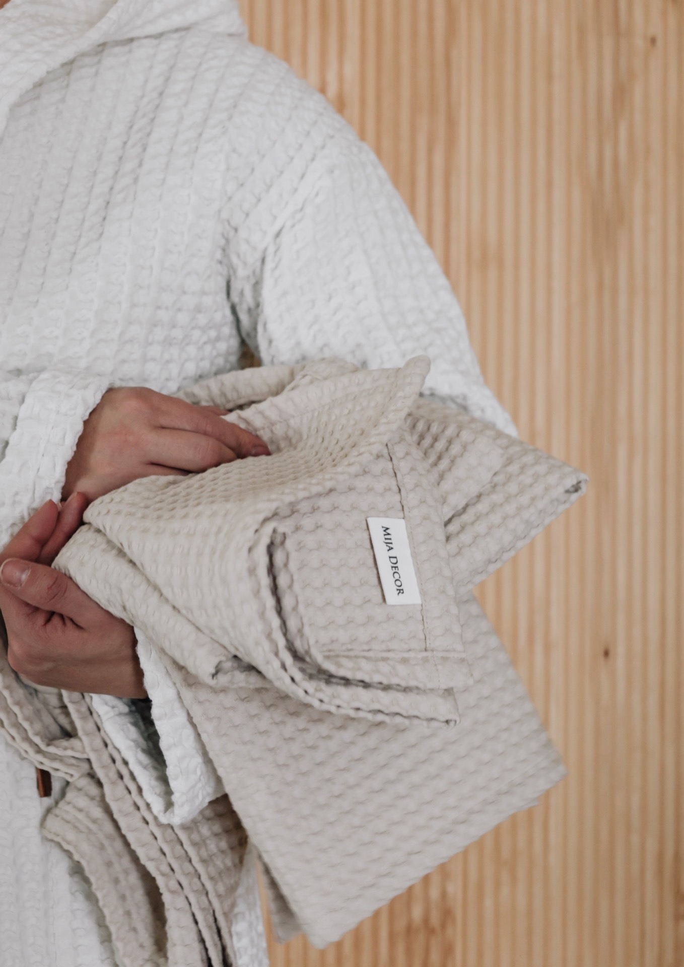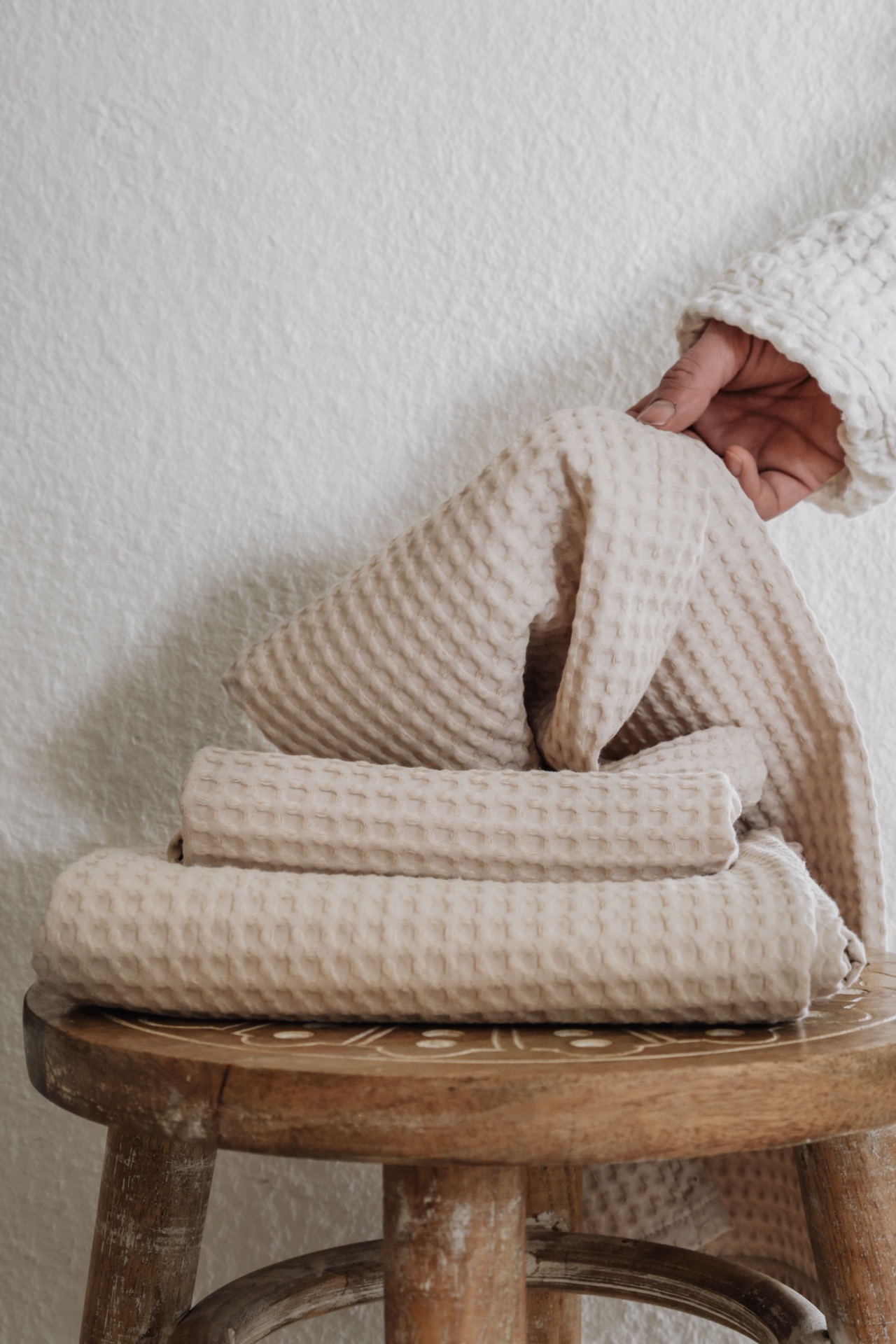 Vohvelikankaiset kylpypyyhkeet beige, suomalainen käsityö